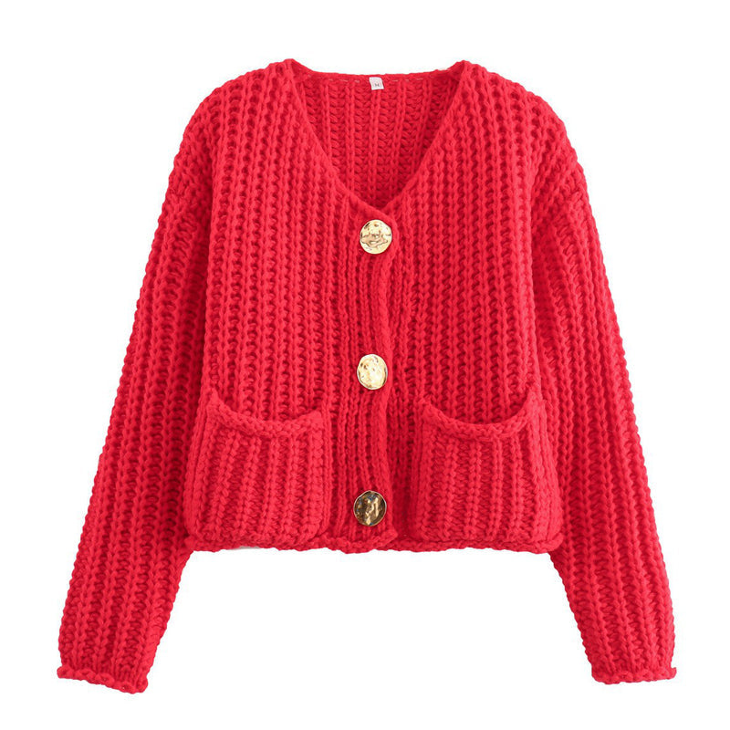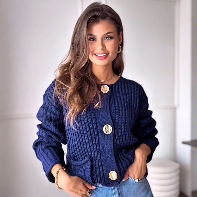 STRIKING GOLD-TONE BUTTONS: The oversized, lustrous gold-tone buttons provide a luxurious contrast against the rich knit, instantly elevating the cardigan from a simple staple to a chic and polished statement piece.