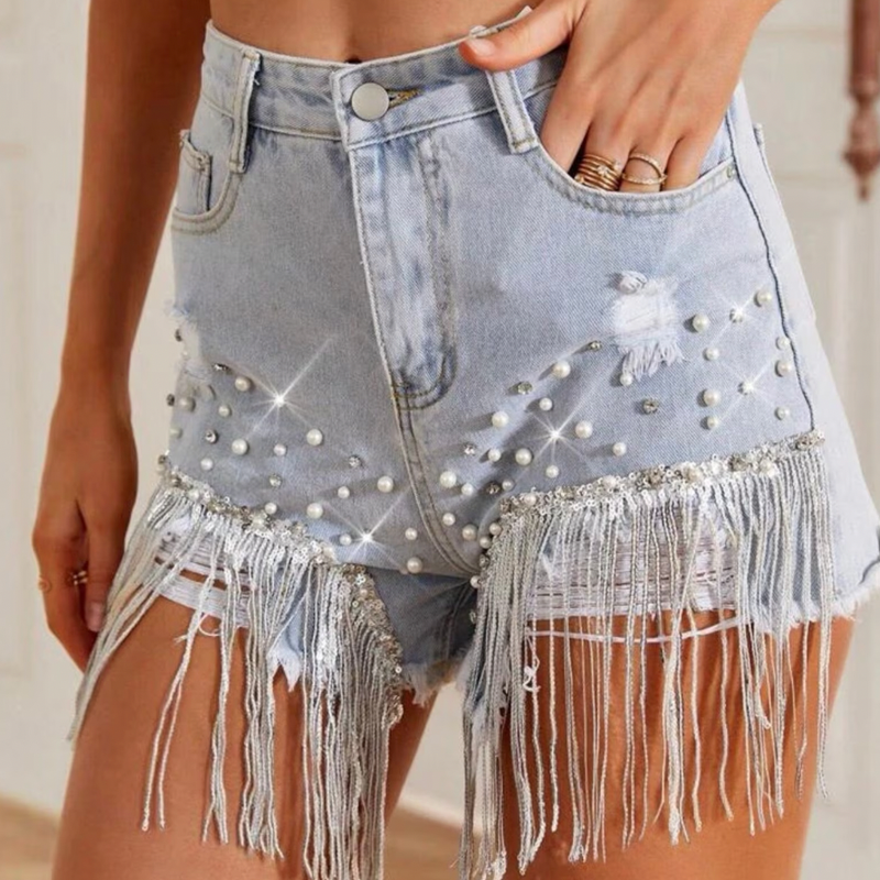 SHIMMERING EMBELLISHMENTS WITH ATTITUDE – Studded with edgy rhinestones and artificial pearls, these shorts blend punk grit with glamorous sparkle. Each detail catches the light (and eyes), transforming basic denim into a head-turning statement. Perfect for those who refuse to play it safe.