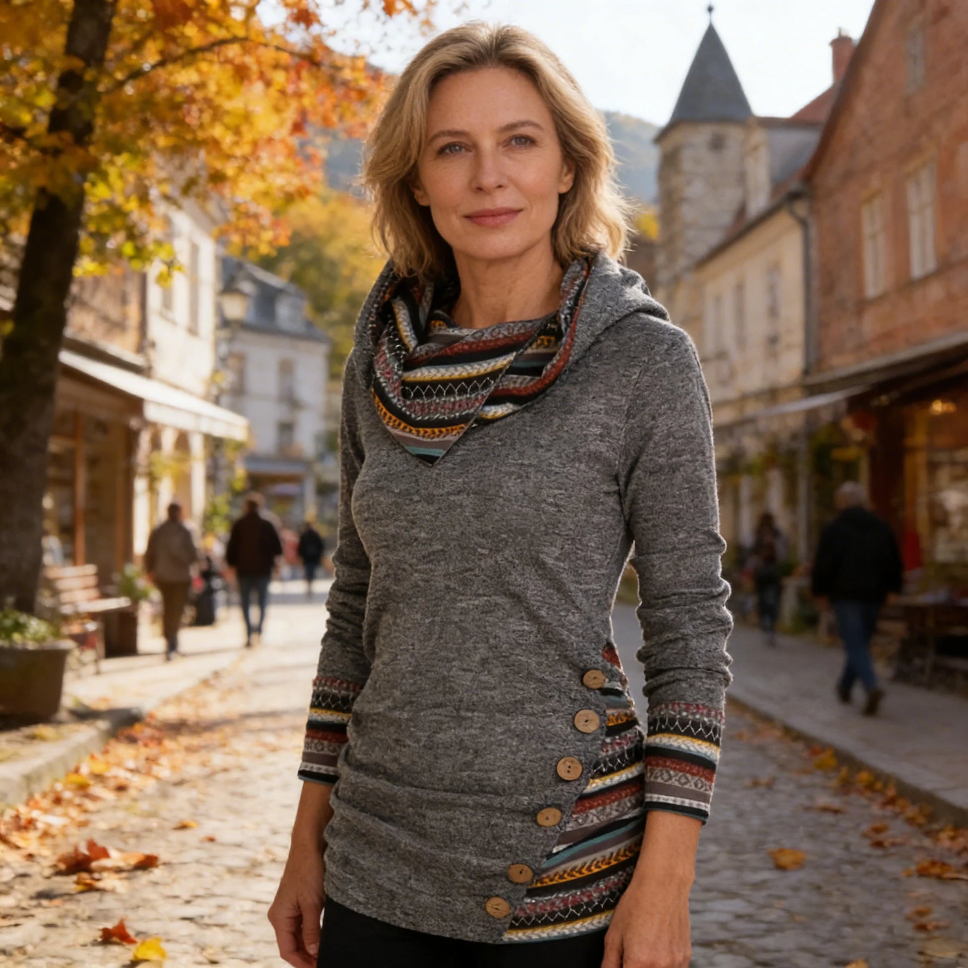 💃Spring Sale 49% OFF⏳Women's Patchwork Ethnic Pattern Fake Buttons Decor Hoodie