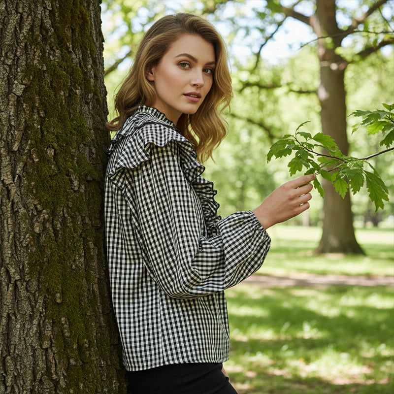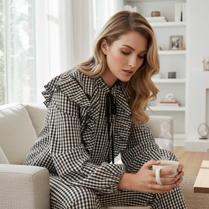 Package Includes: 1 * Women's Gingham Ruffle Tie-Neck Blouse