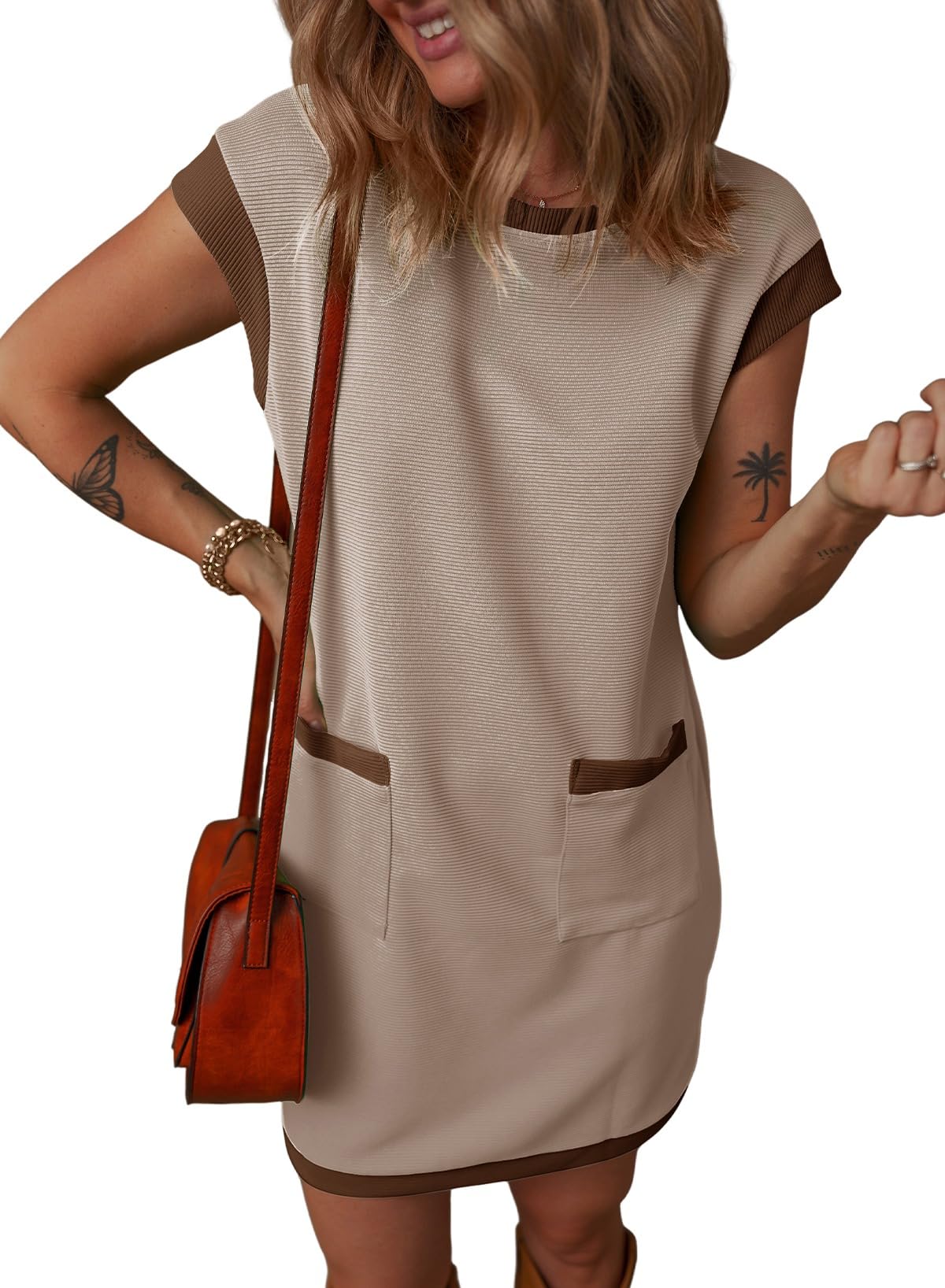 💥2025 New Women's Casual Cap Sleeve Color Block Shift Tshirt Dress With Pockets