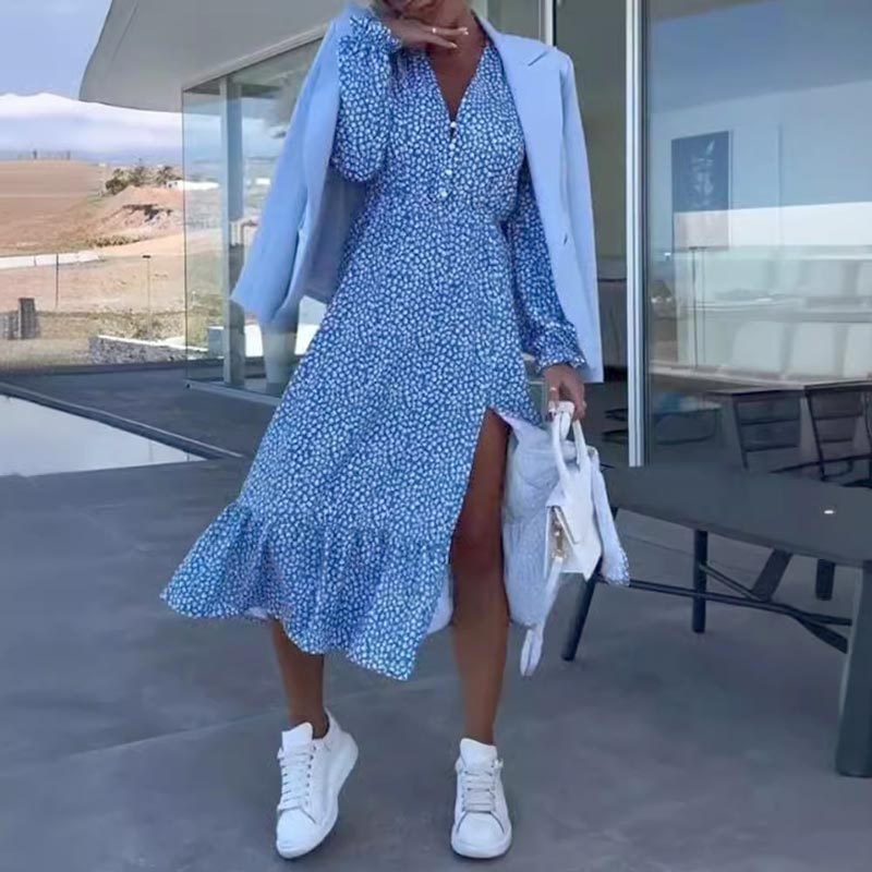 Package Includes: 1 * Women’s Blue Printed V-neck Long-sleeve Dress