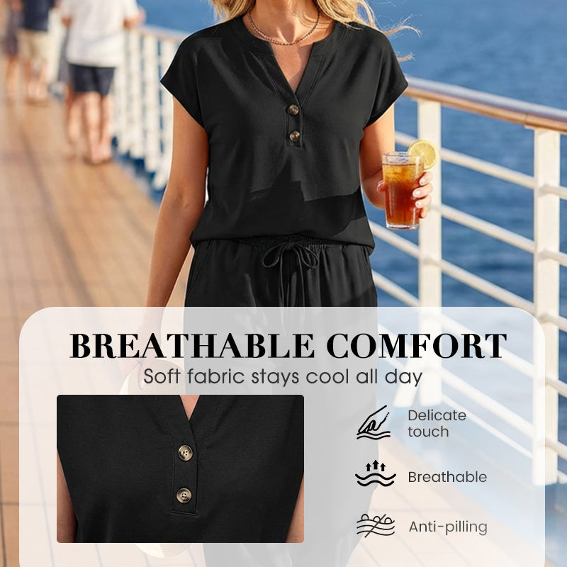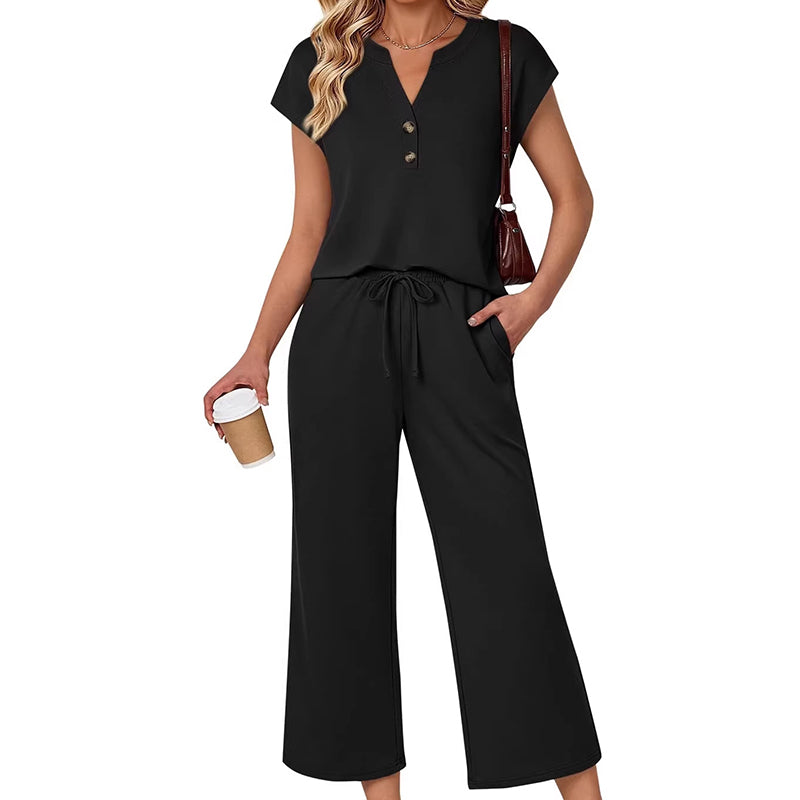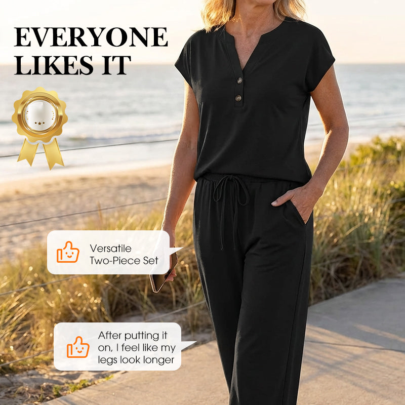 ELEGANT V-NECK TOP - The V-neck top with a simple button placket adds a touch of casual elegance, elevating the set beyond basic loungewear and making it suitable for various informal occasions.