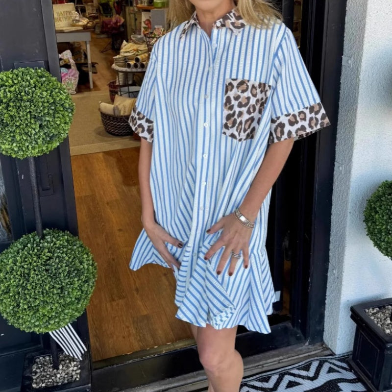 1 × Women's Fashion Striped Patchwork Leopard Print Shirt Dress
