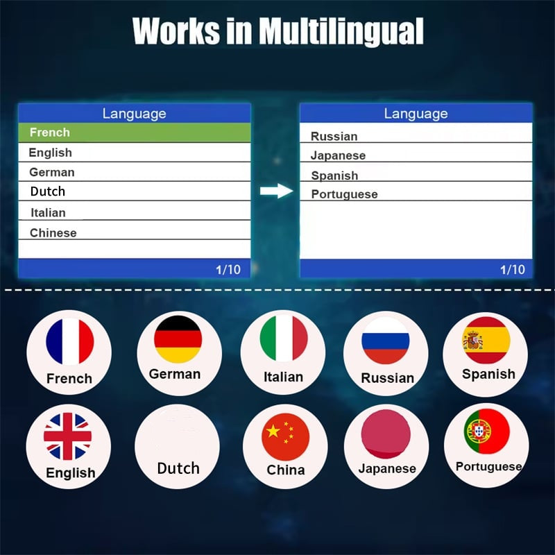 MULTILINGUAL SUPPORT: Supports 10 languages: English, German, French, Spanish, Italian, Russian, Dutch, Chinese, Japanese, and Portuguese, ideal for international drivers.