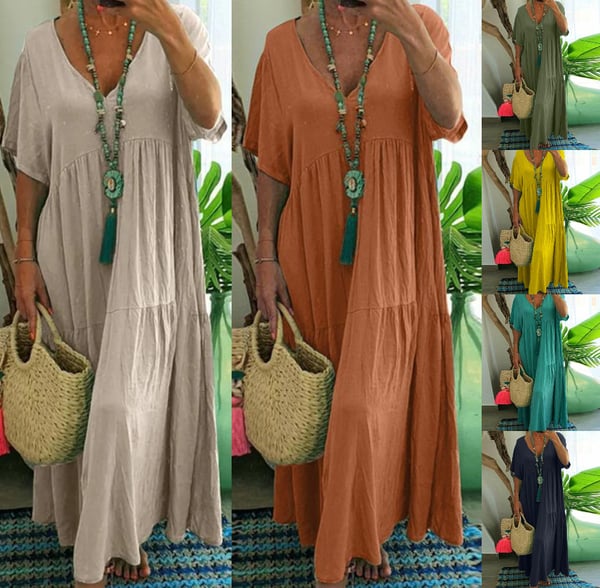 🌼 The relaxed and flowy silhouette ensures a comfortable fit and allows for easy movement. Dress it up with accessories and heels for a more polished look, or keep it casual with flats and minimal jewelry. The possibilities are endless with our Women's Casual Long Dress with Short Sleeves. 💃🏻