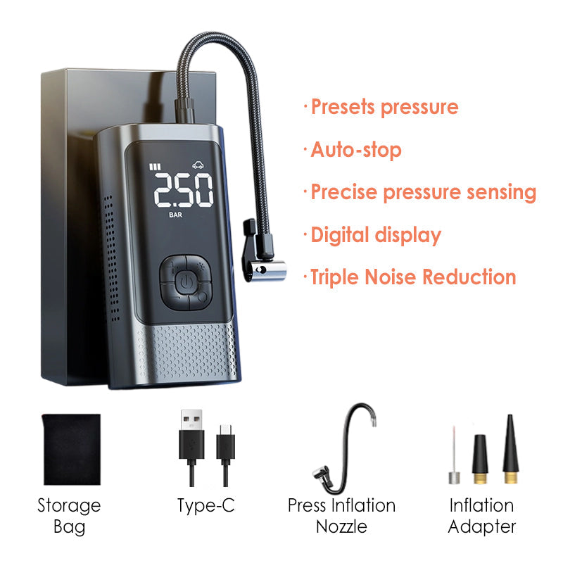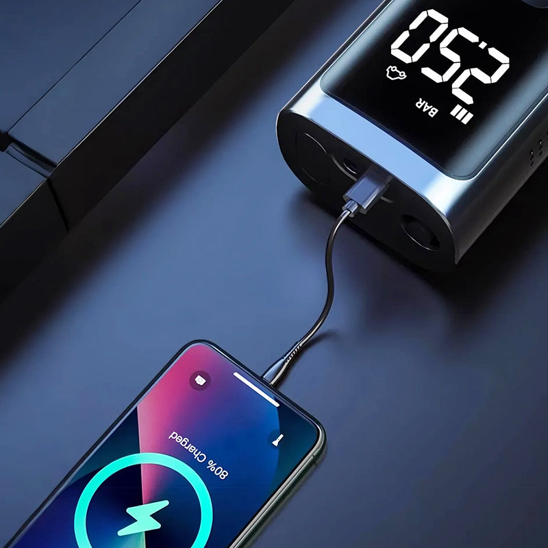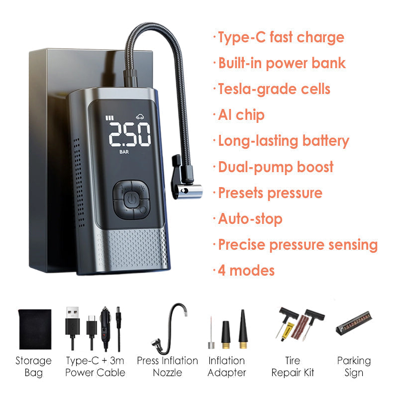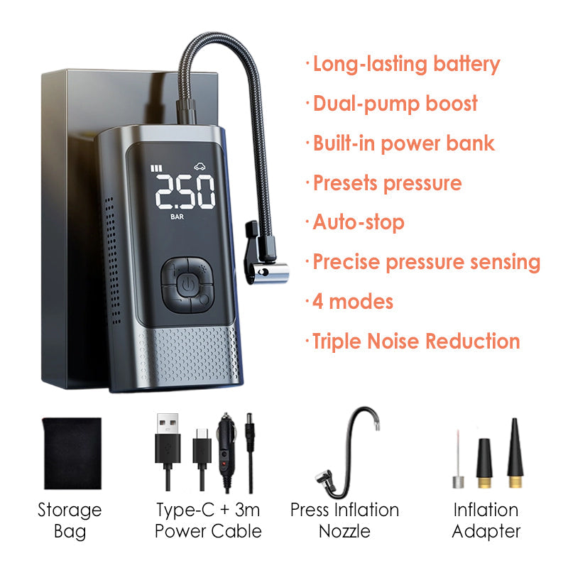 ALL-IN-ONE MULTI-SCENARIO USE: Designed for versatility, it inflates car, motorcycle, and bicycle tires and sports balls like basketballs or soccer balls. Includes a full set of nozzles for various valve types. Doubles as a portable power bank and supports car charging mode, offering dual functionality for daily use and roadside emergencies.